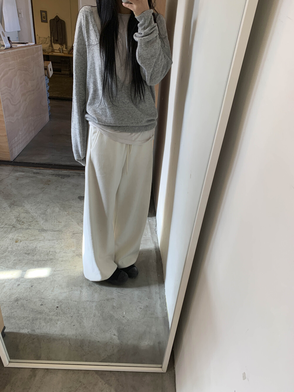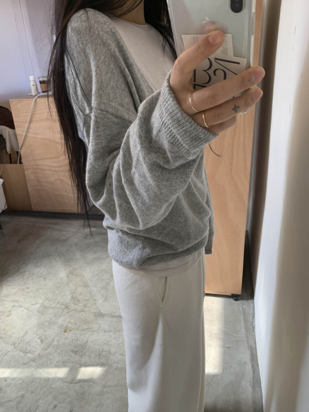 어깨에 훌렁 넘어가는 매력이 있어서 오프숄더를 입은 듯한 느낌도 들어요. 넥이 답답한 니트는 잘 안입게되는데 이렇게 시원하게 파여있으니 오히려 얼굴이 날렵해보여서 손이 자주 가게되더라구요.