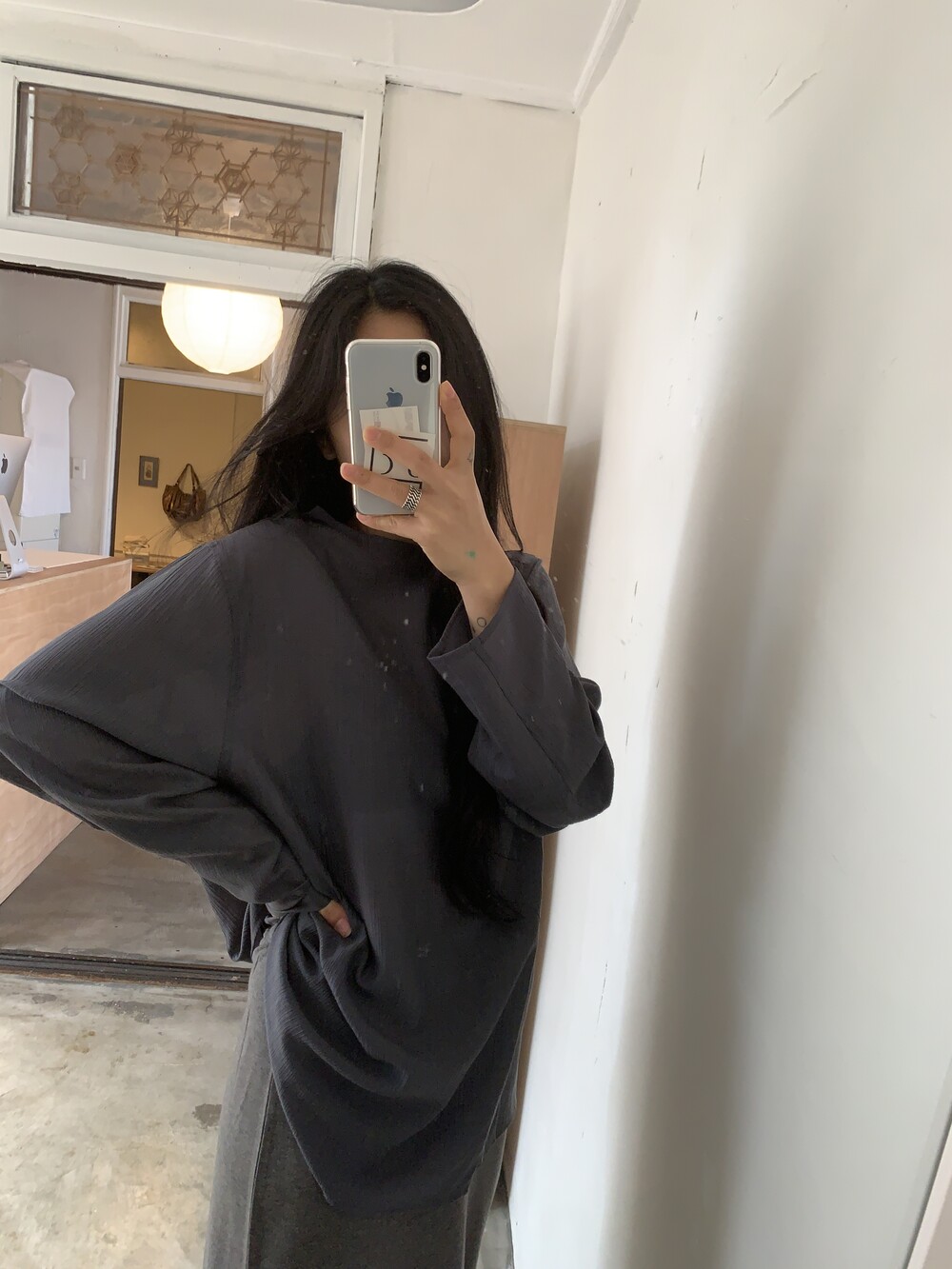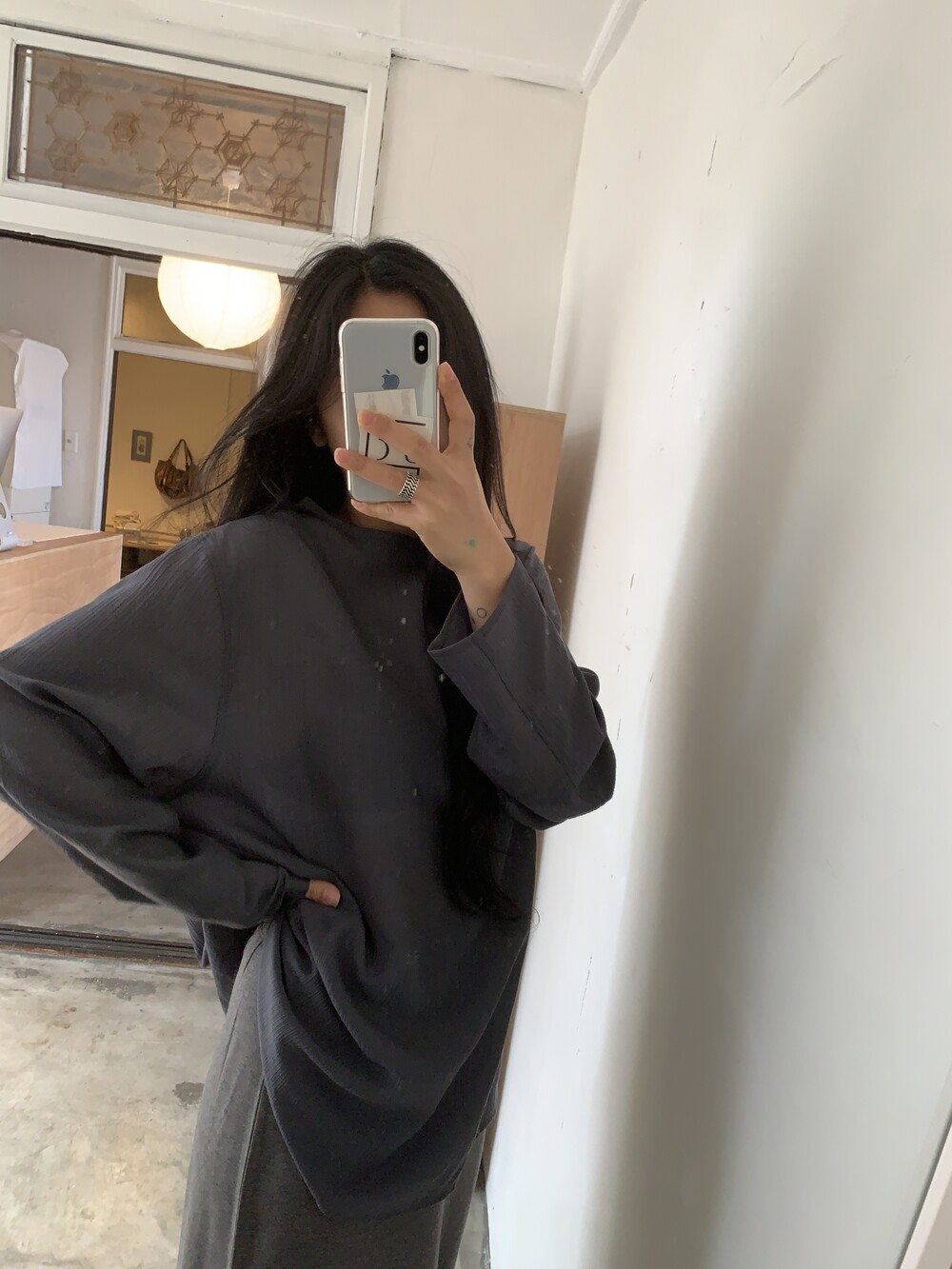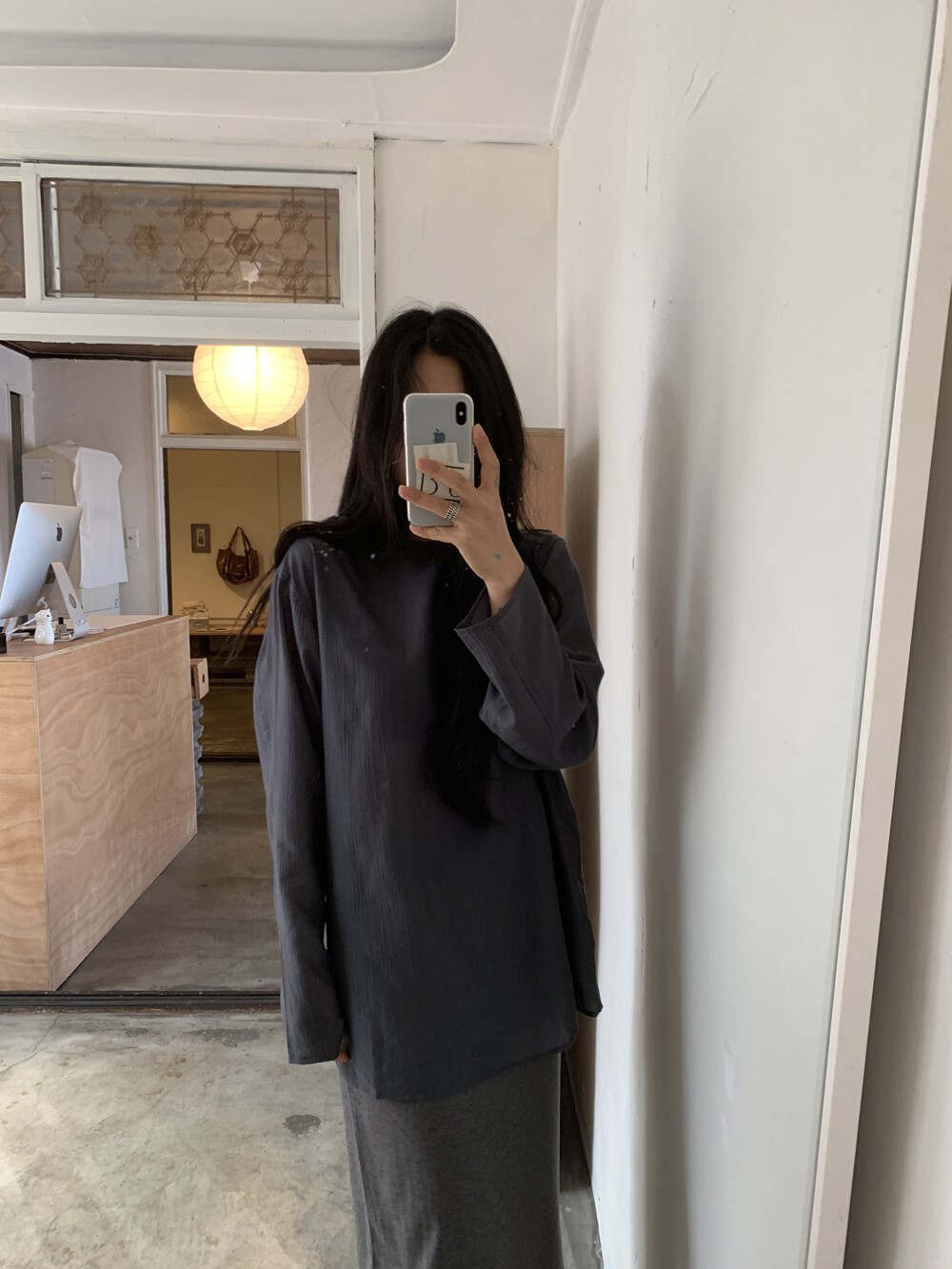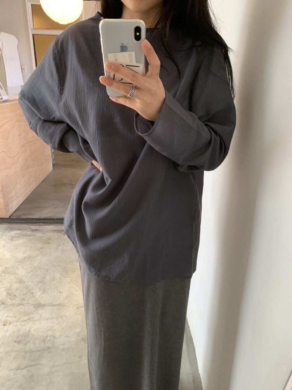 깔끔한 라운드 형태의 오버핏 블라우스입니다. 디자인적으로 포인트가 없어 미니멀한 느낌이 드는데요..! 입어보면 핏감 하나로 완성형인 제품입니다.
