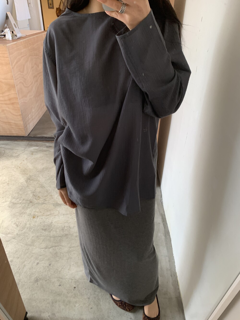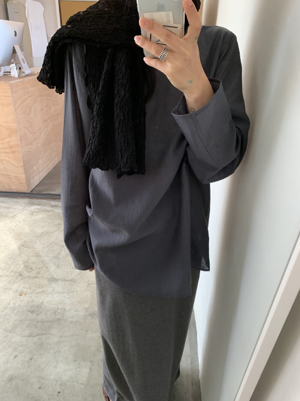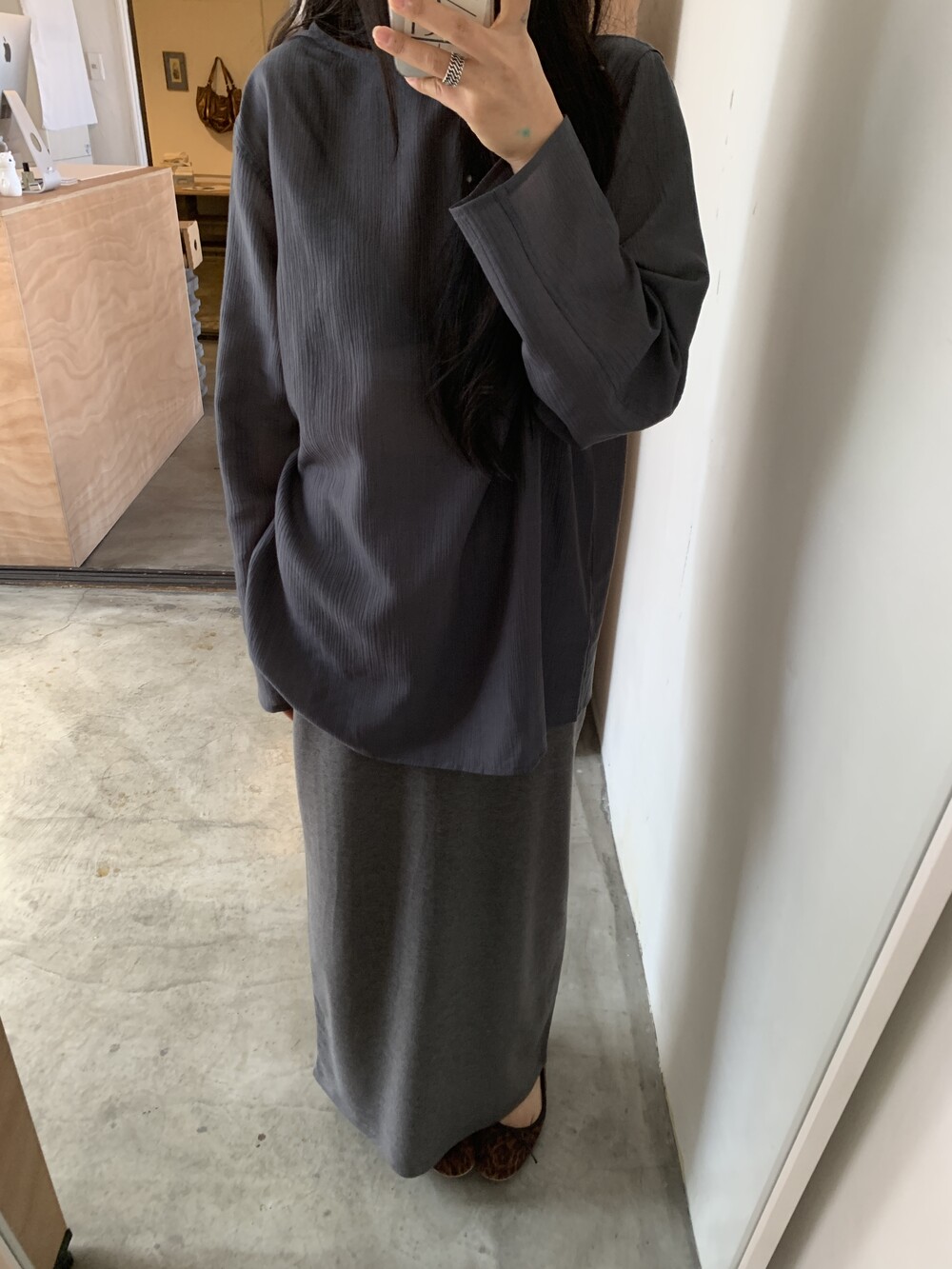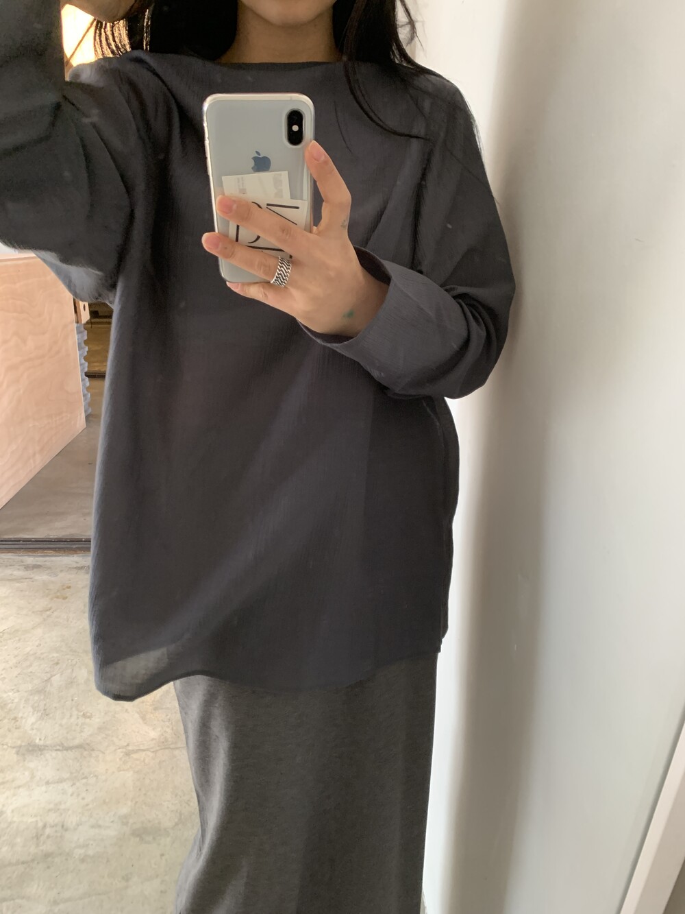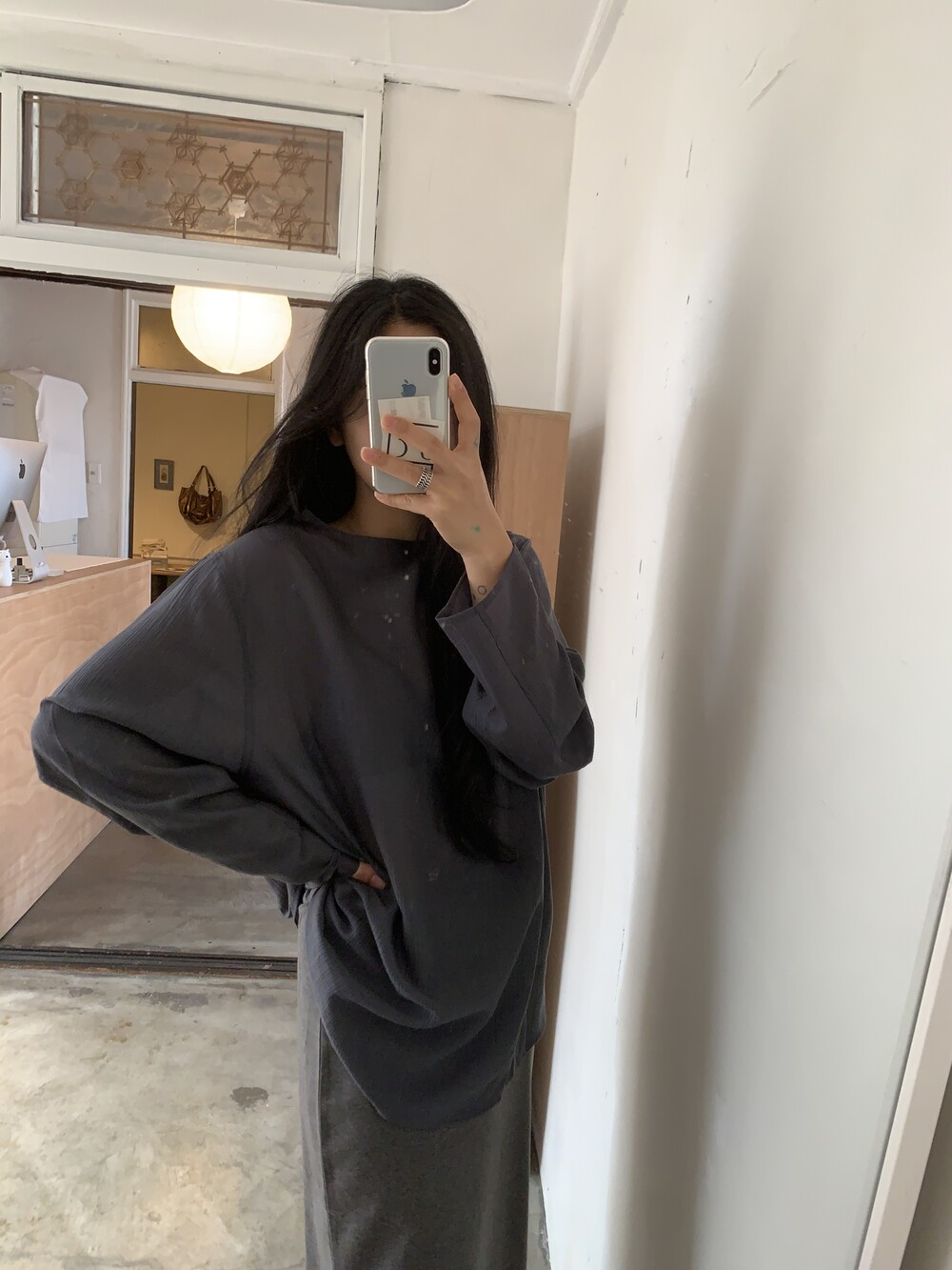 깔끔한 라운드 형태의 오버핏 블라우스입니다. 디자인적으로 포인트가 없어 미니멀한 느낌이 드는데요..! 입어보면 핏감 하나로 완성형인 제품입니다.