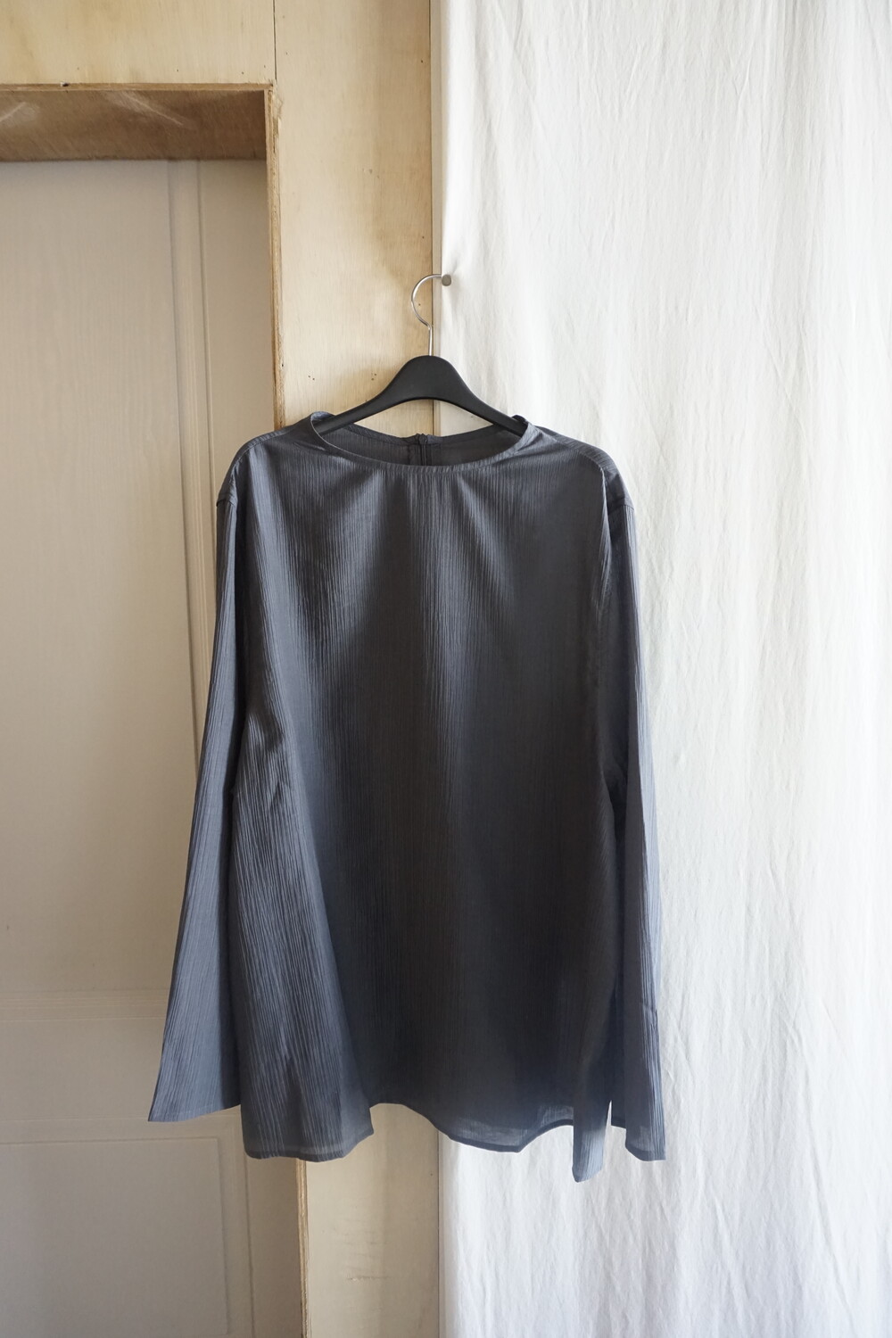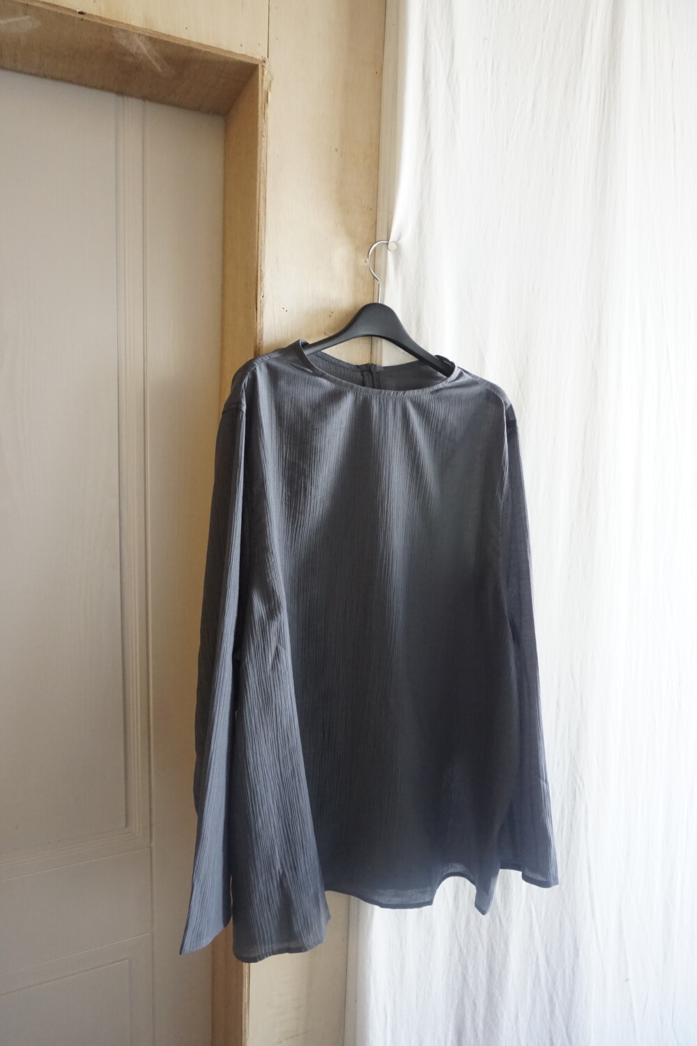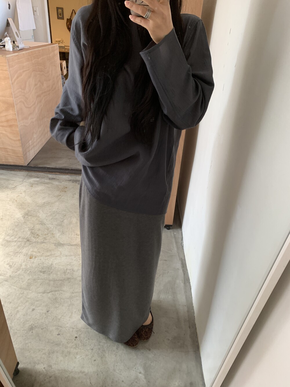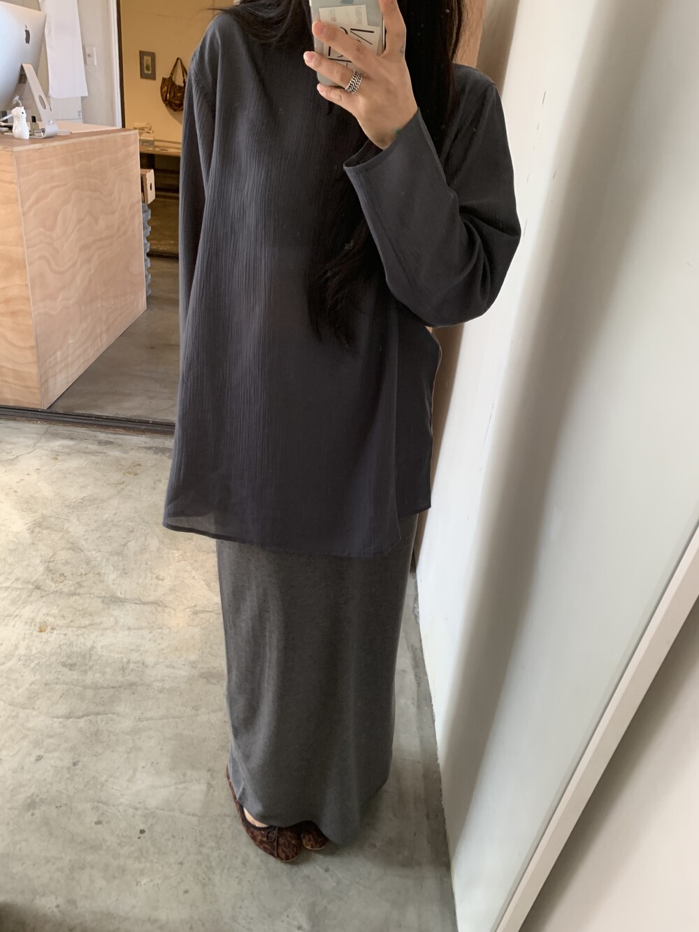 깔끔한 라운드 형태의 오버핏 블라우스입니다. 디자인적으로 포인트가 없어 미니멀한 느낌이 드는데요..! 입어보면 핏감 하나로 완성형인 제품입니다.