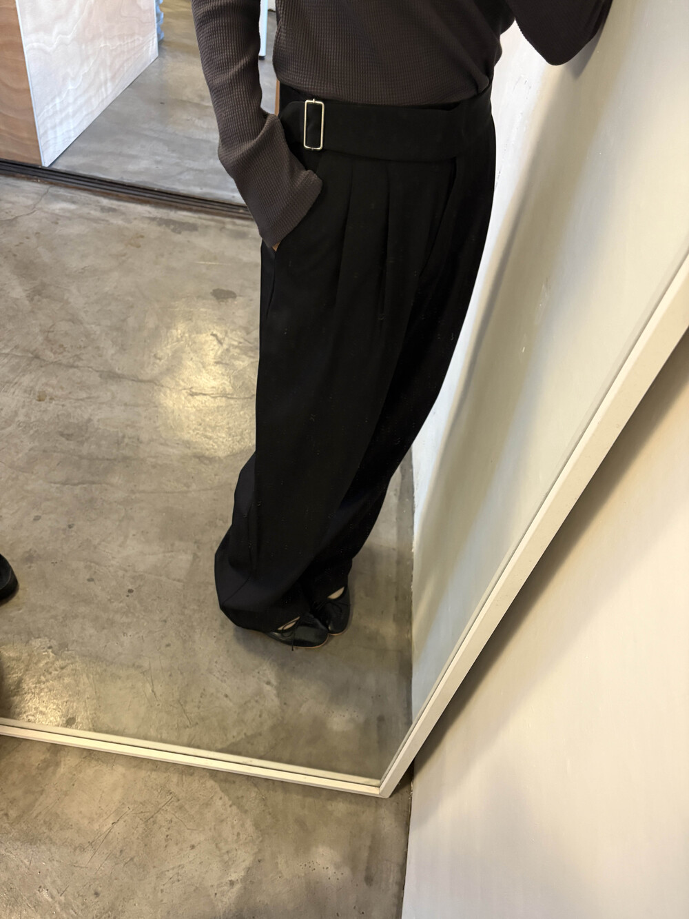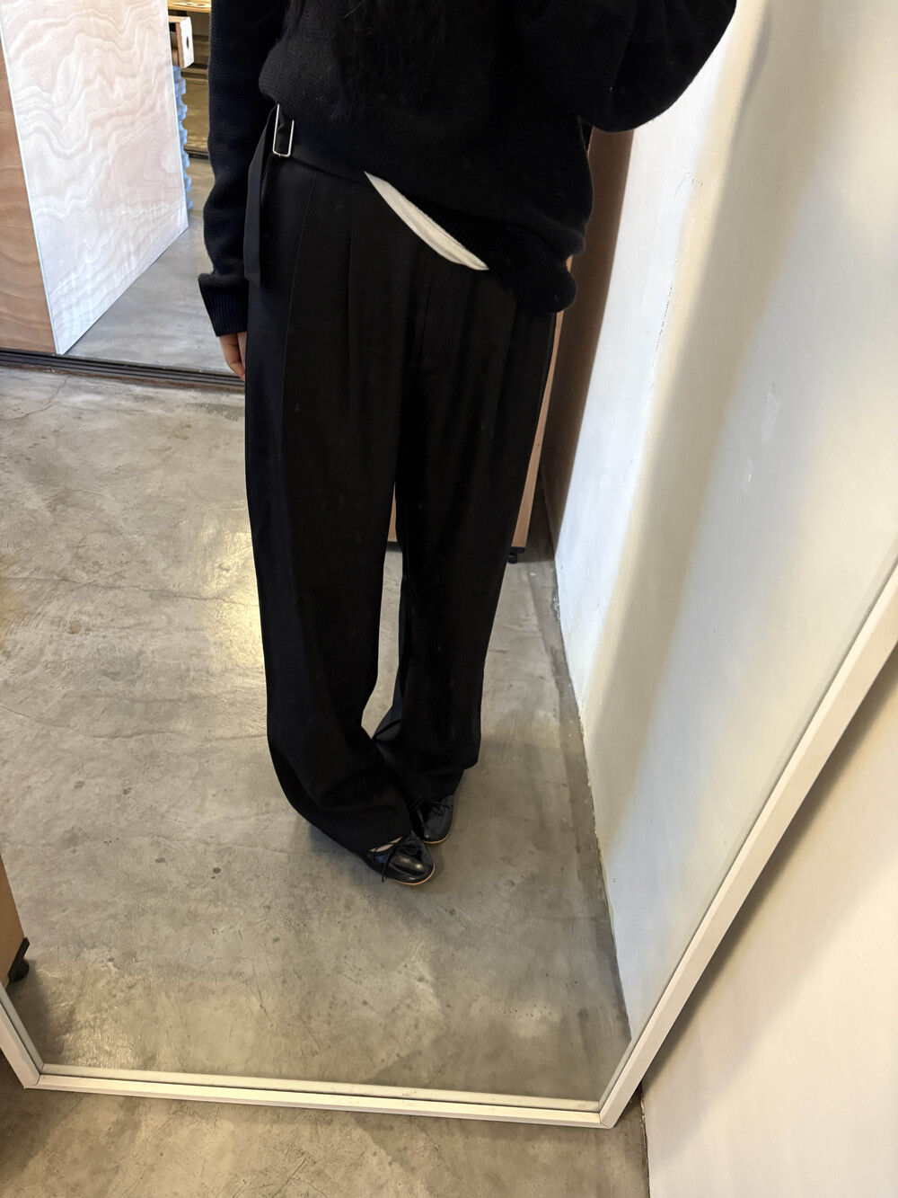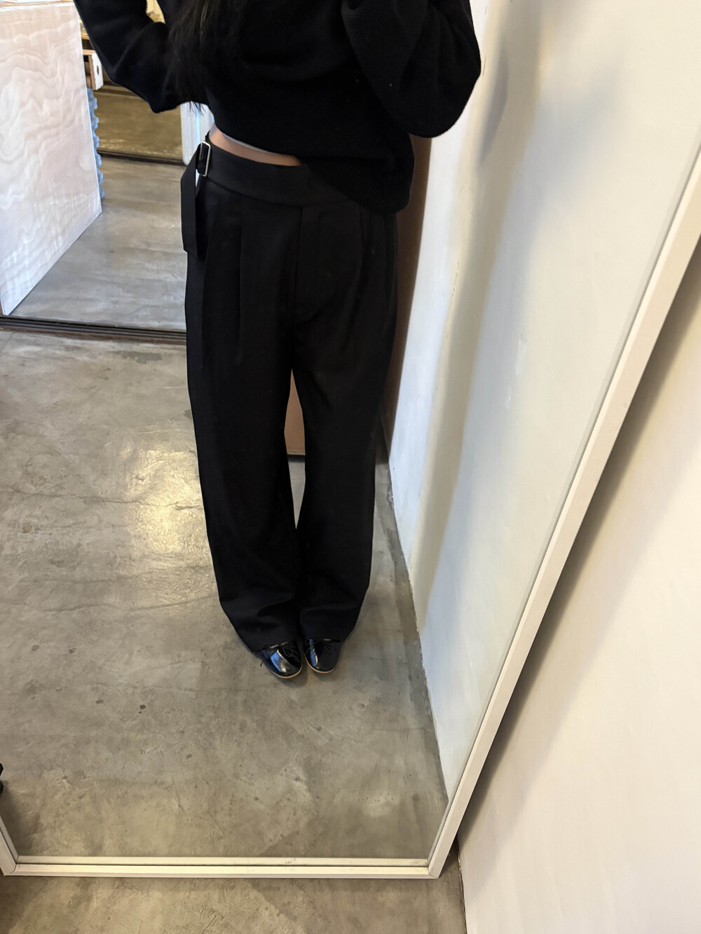 하이웨스트라인이지만 너무 허리보다는 살짝 아래로 입었을때 더욱 멋드러졌습니다....! 벨트 안보이게 박시한 니트에도 매력적인 슬랙스에요. 딱 기본핏.