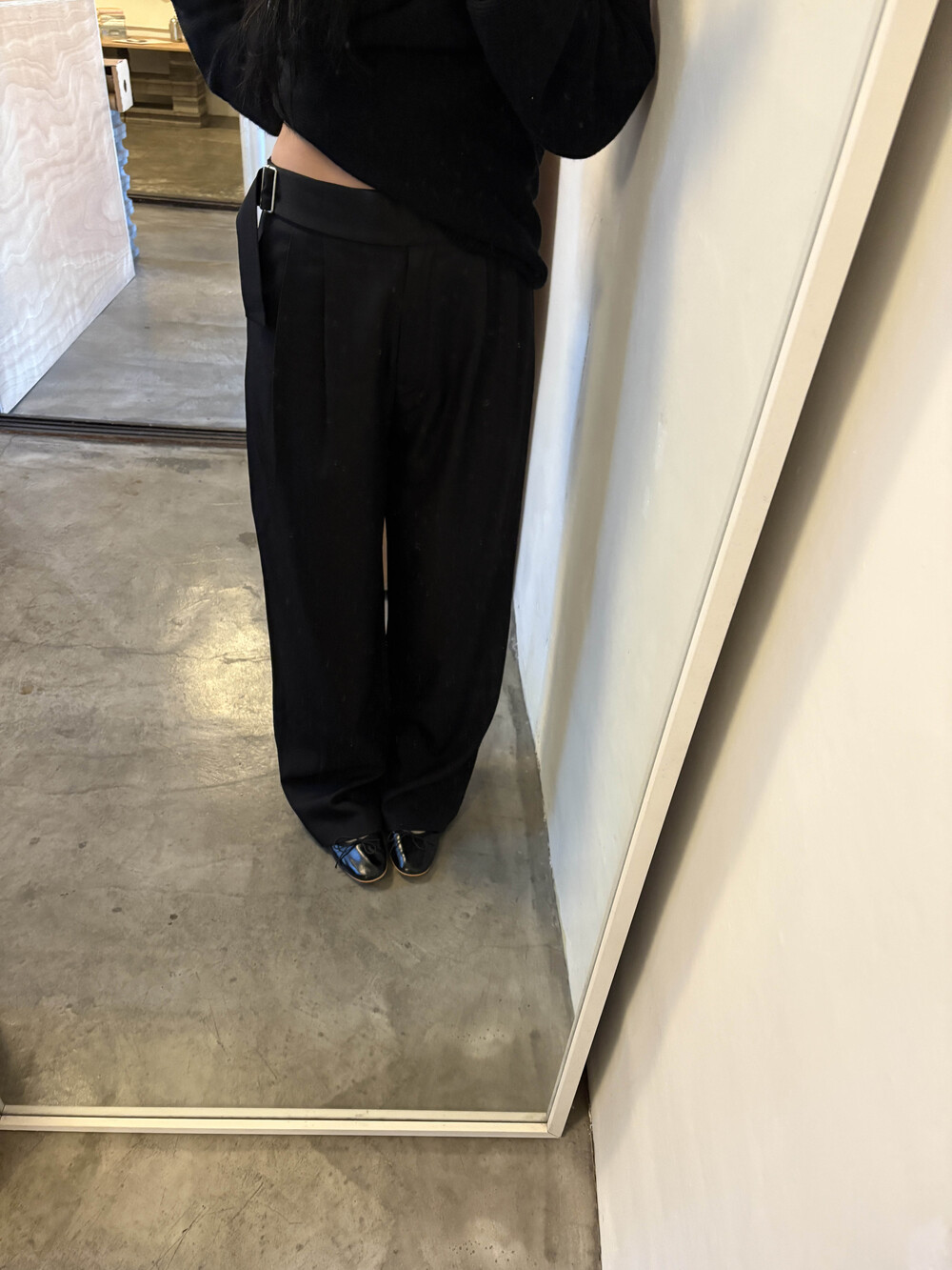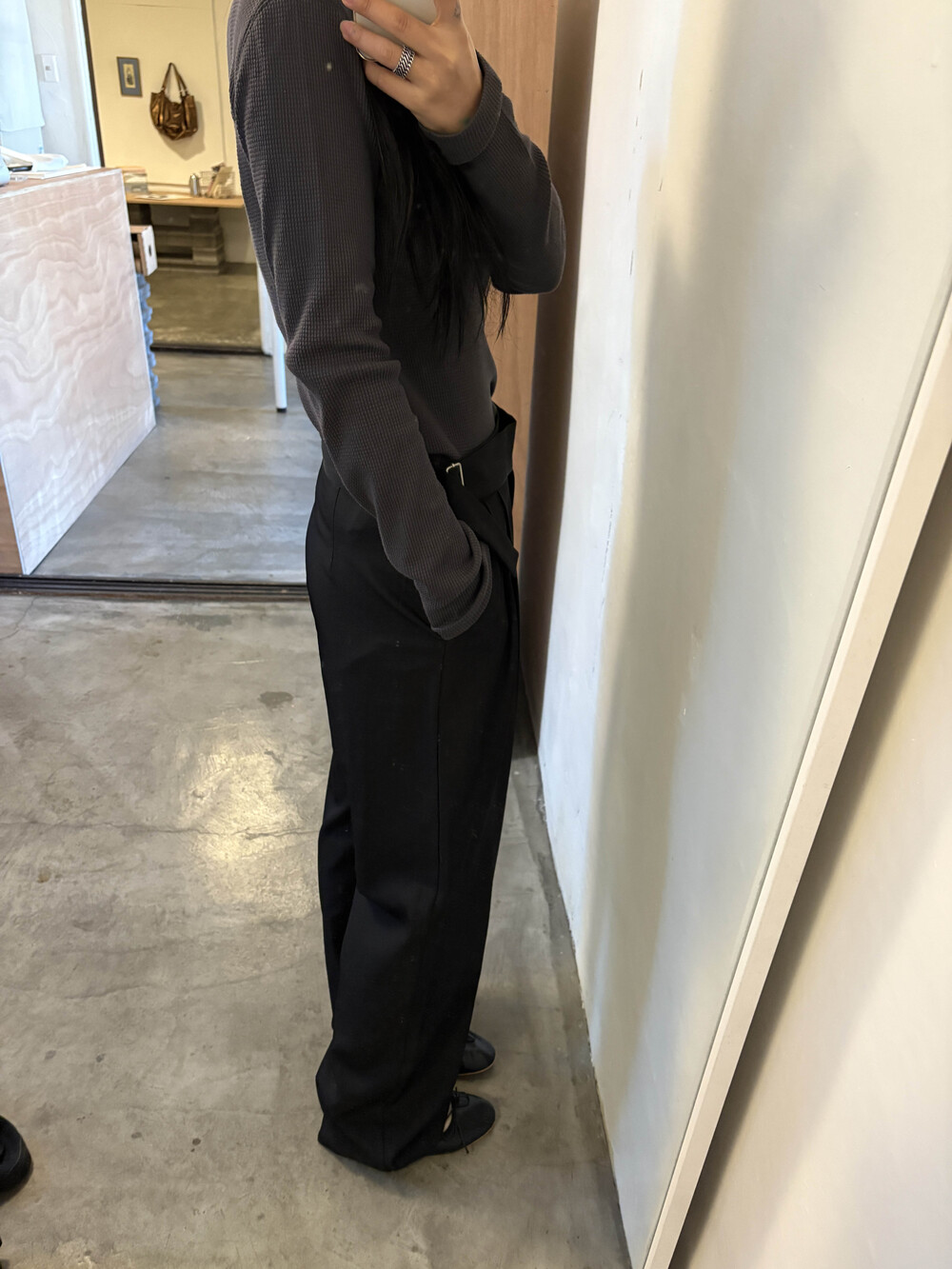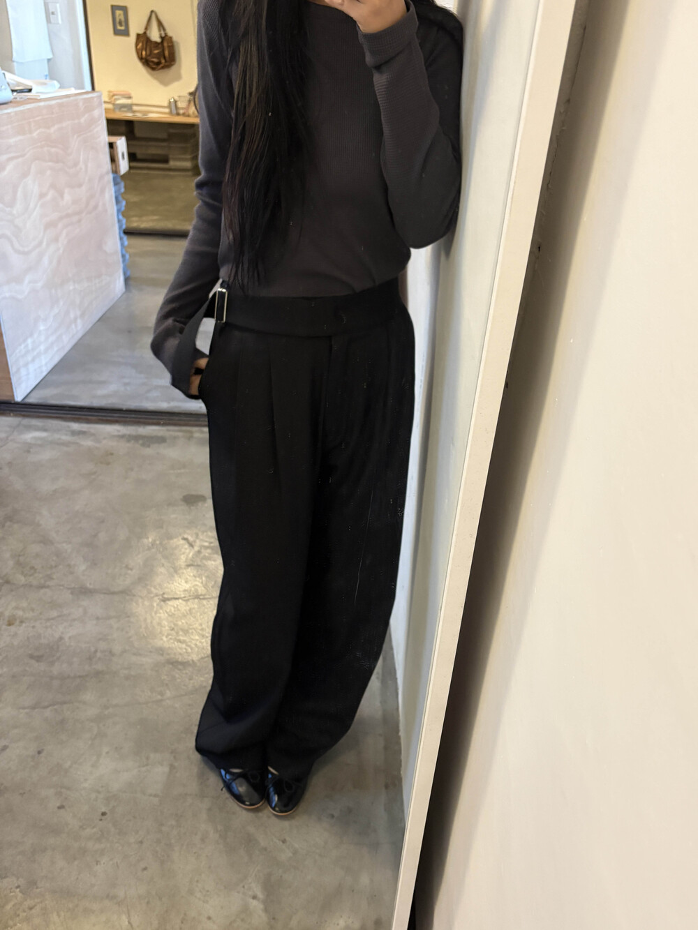 하이웨스트라인이지만 너무 허리보다는 살짝 아래로 입었을때 더욱 멋드러졌습니다....! 벨트 안보이게 박시한 니트에도 매력적인 슬랙스에요. 딱 기본핏.