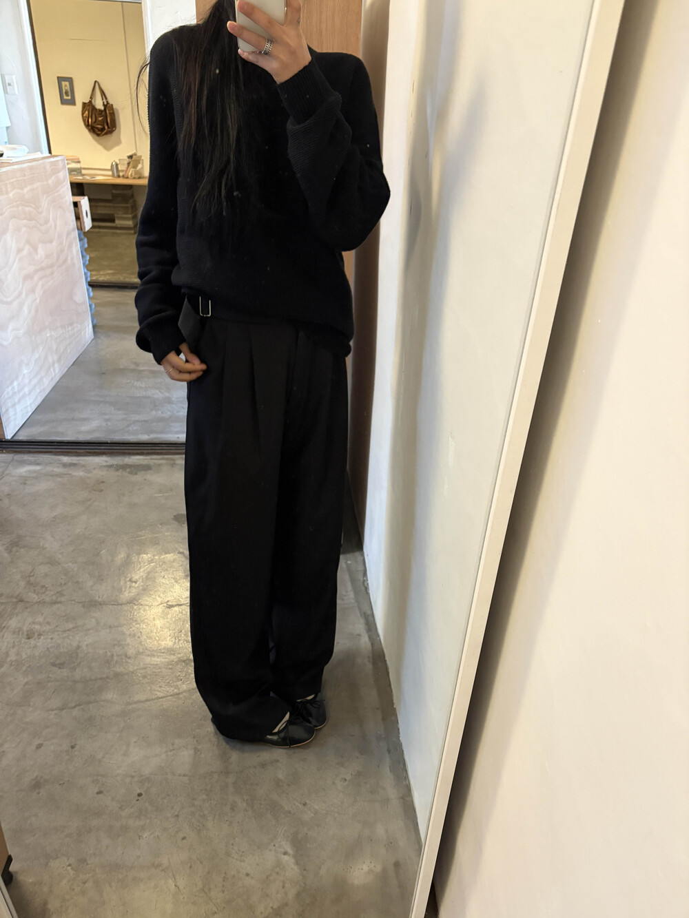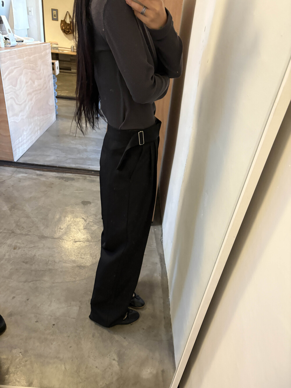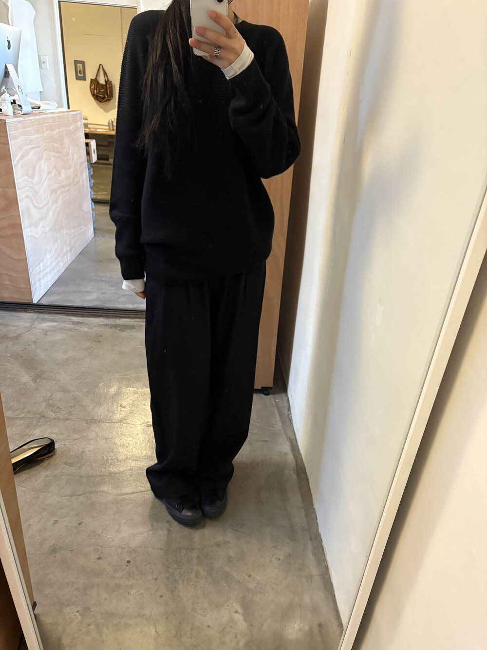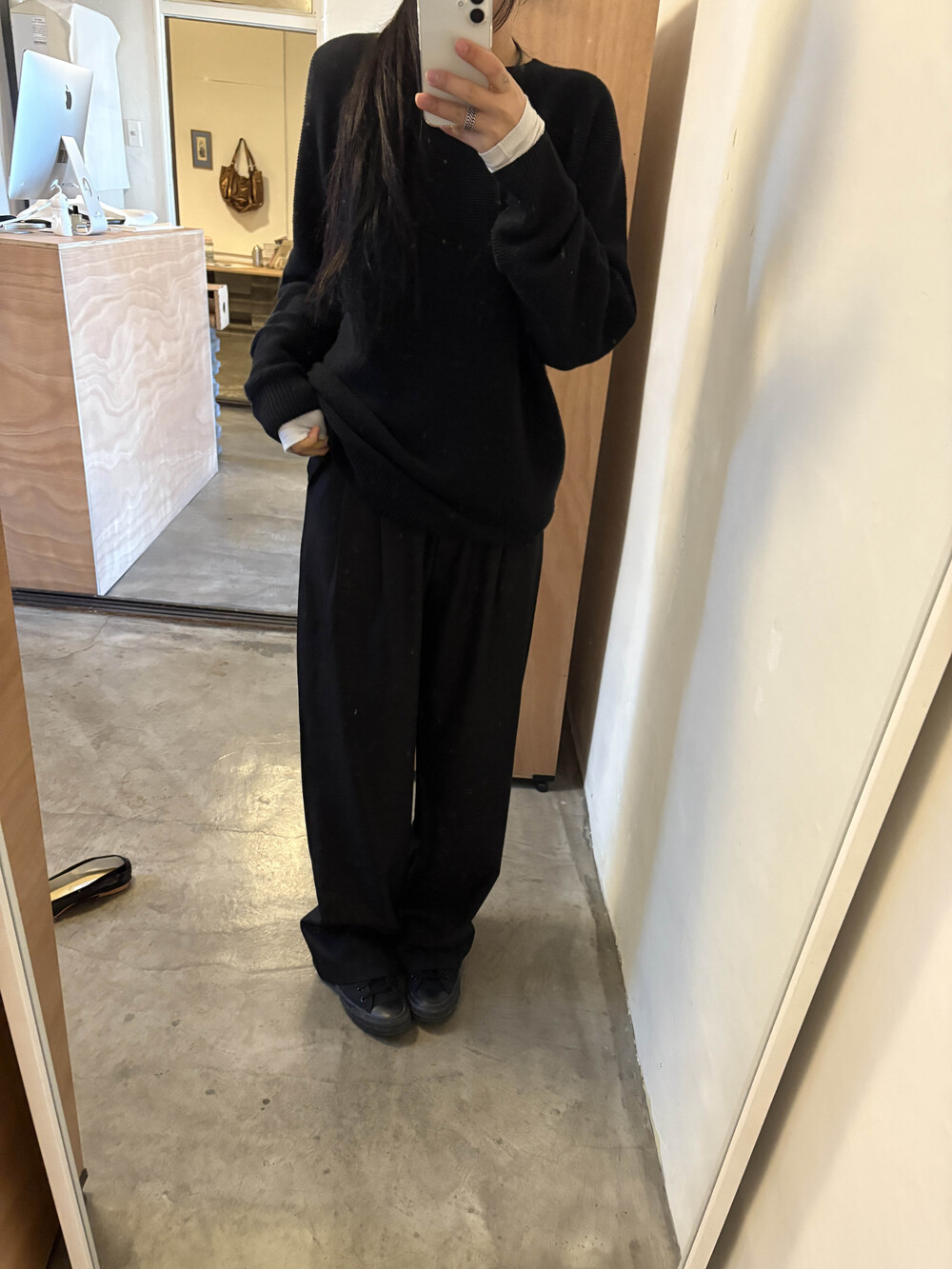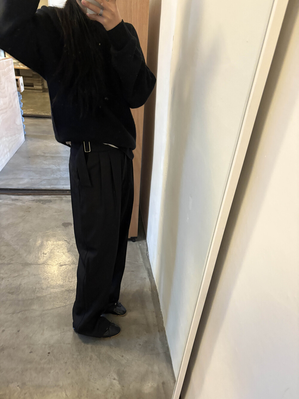 굽이 아예없는 플랫슈즈를 착용하고 입었을때의 기장감으로 보여드려요 : )
