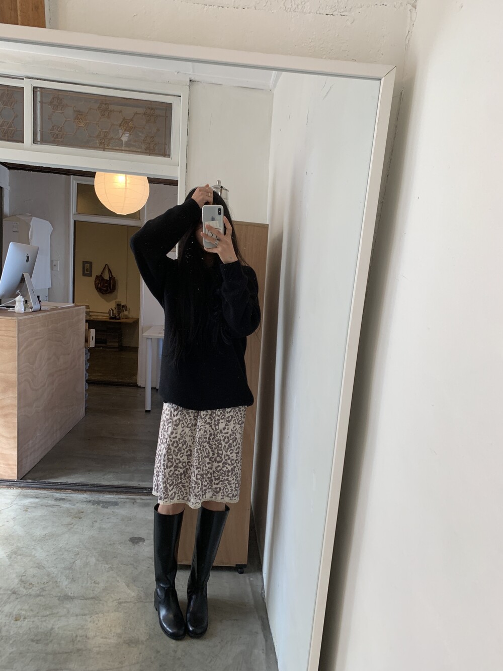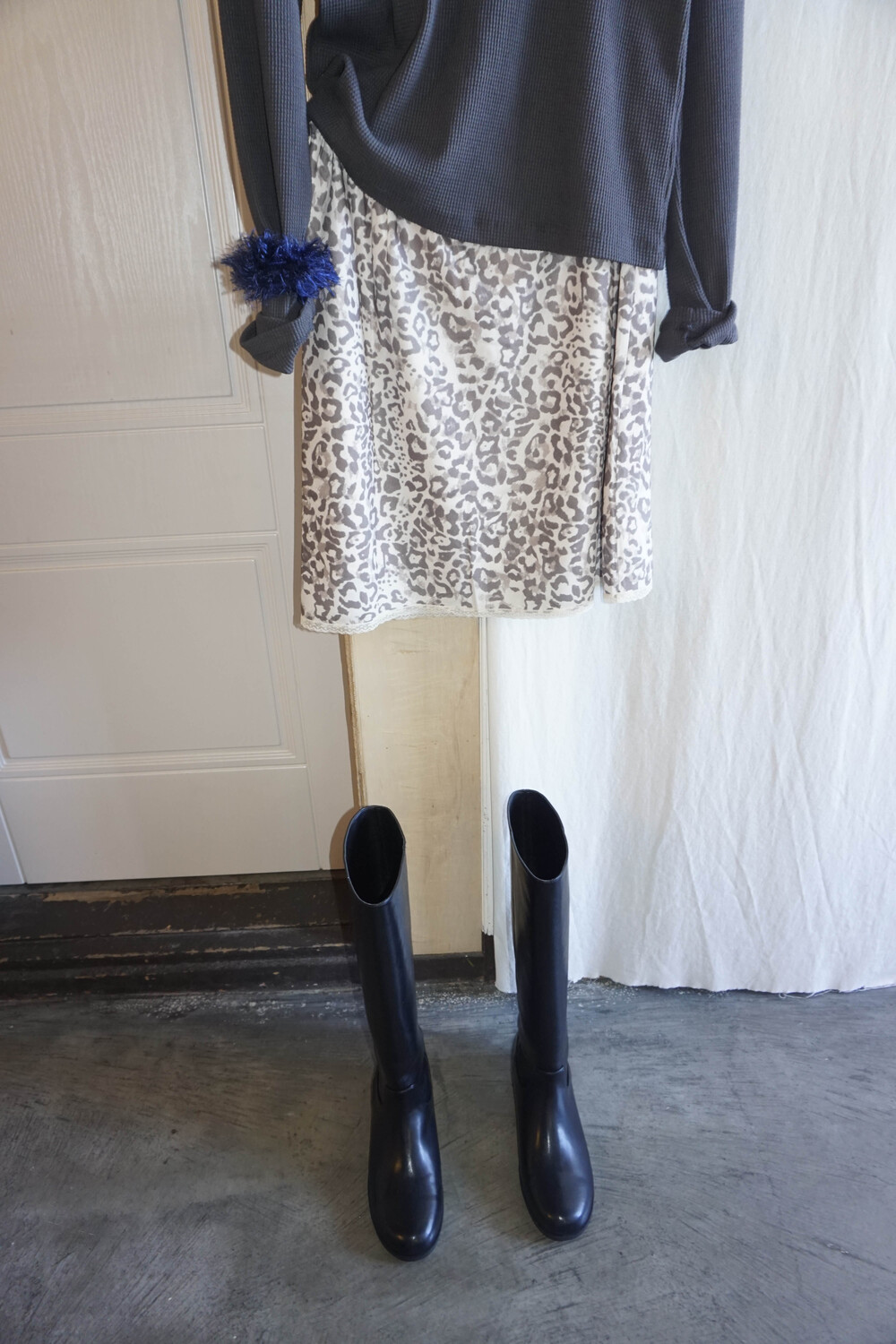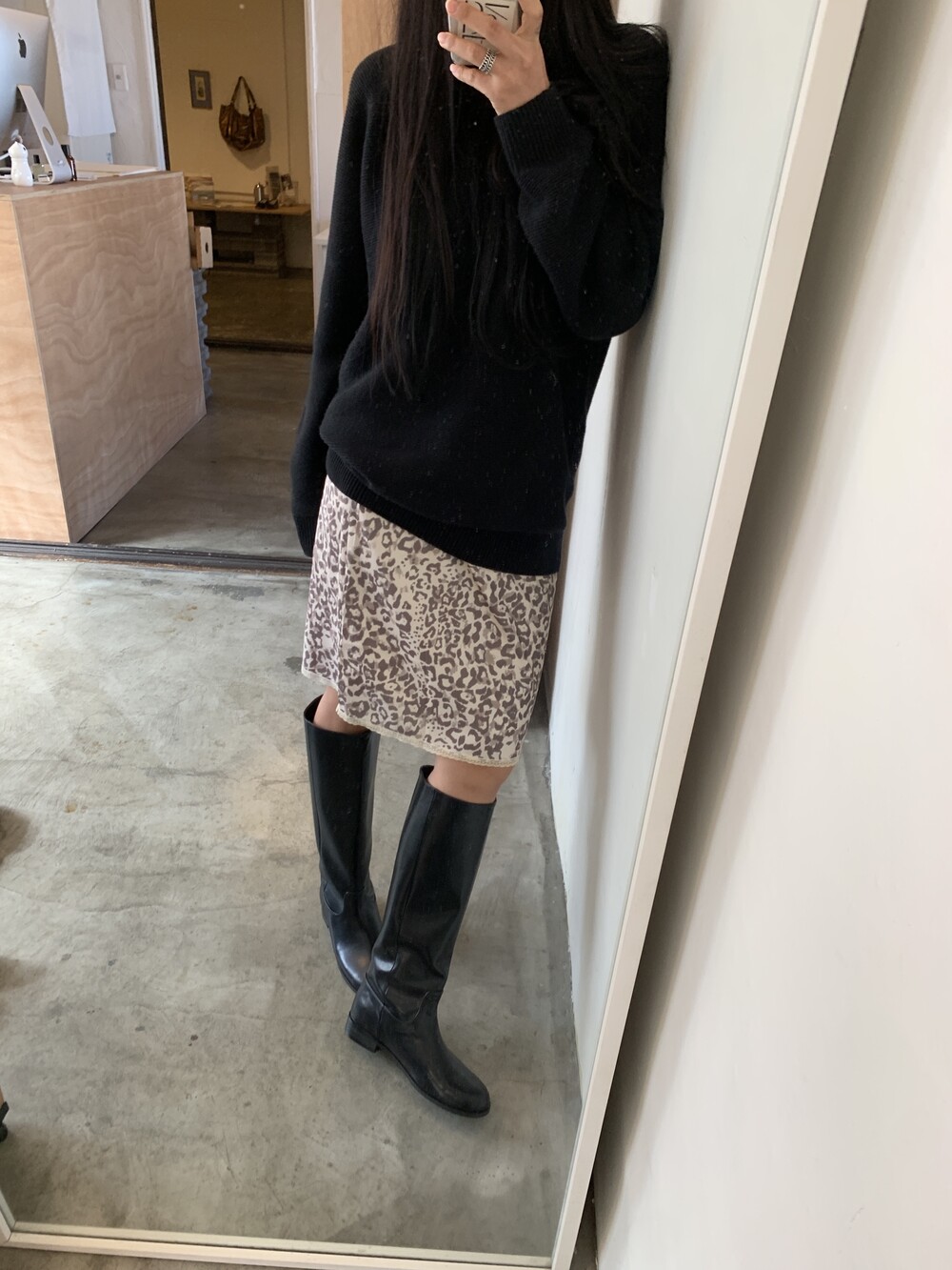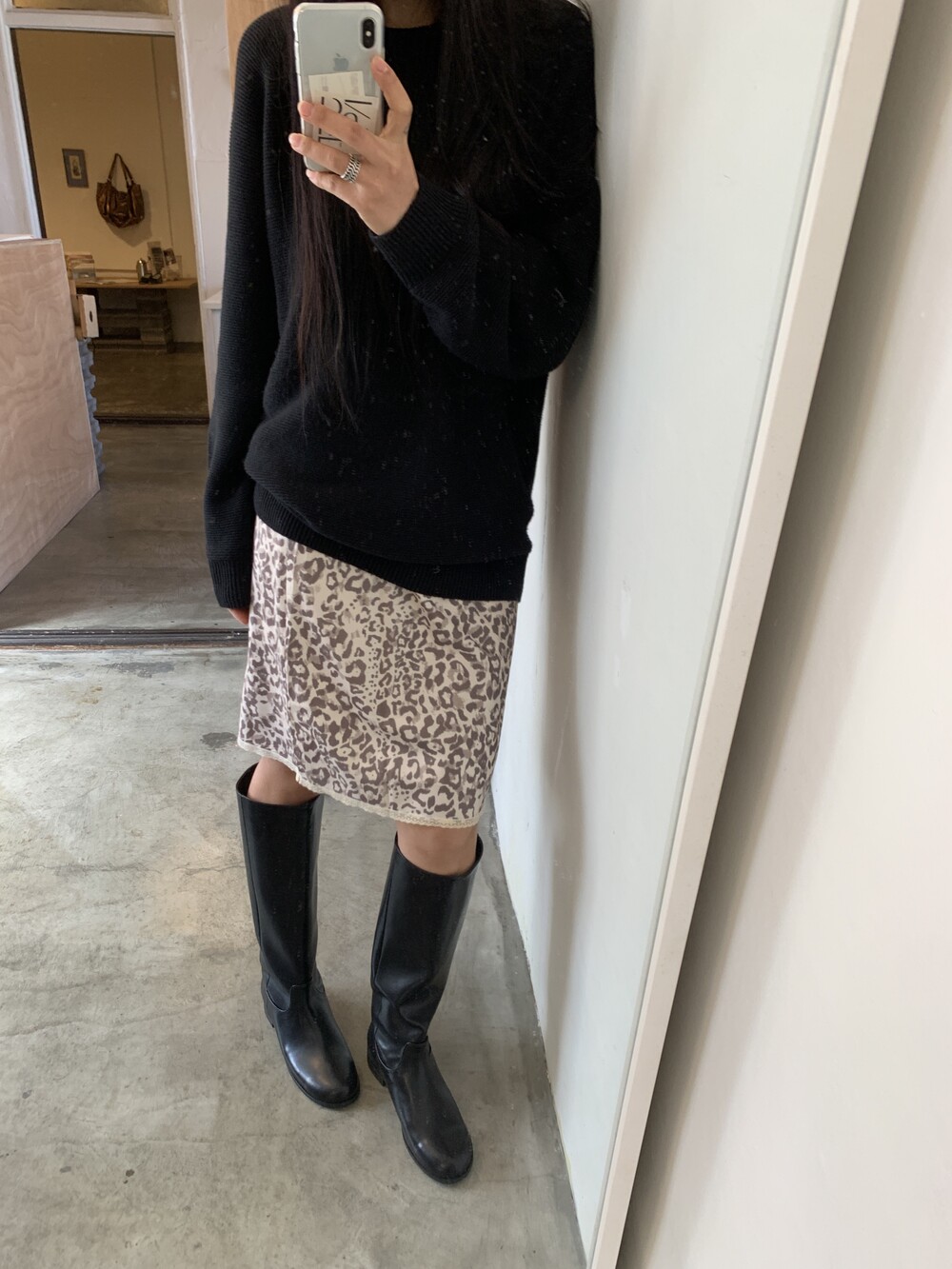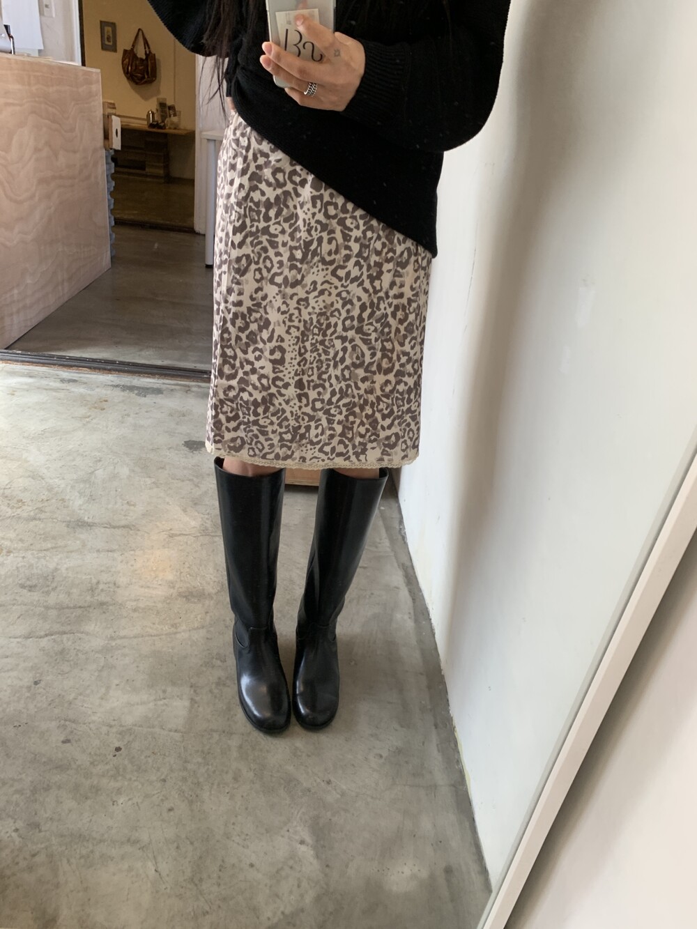 미디 기장의 호피 스커트입니다. 색감이 튀지않아서 패턴이 있어도 크게 부담스럽지 않는 것이 이 스커트의 매력 포인트에요.