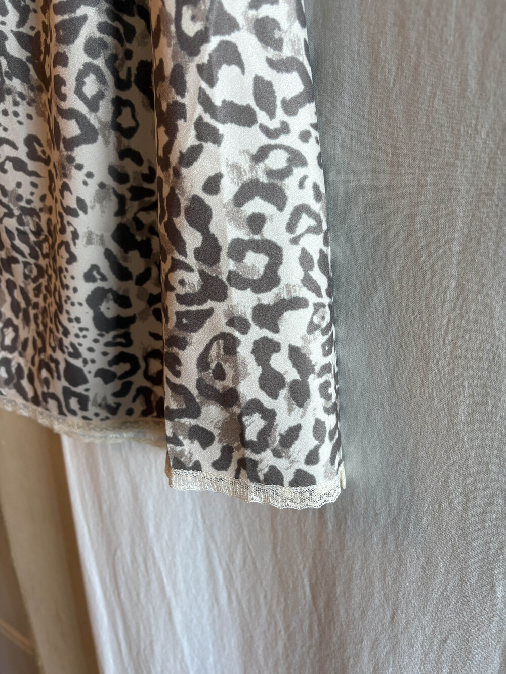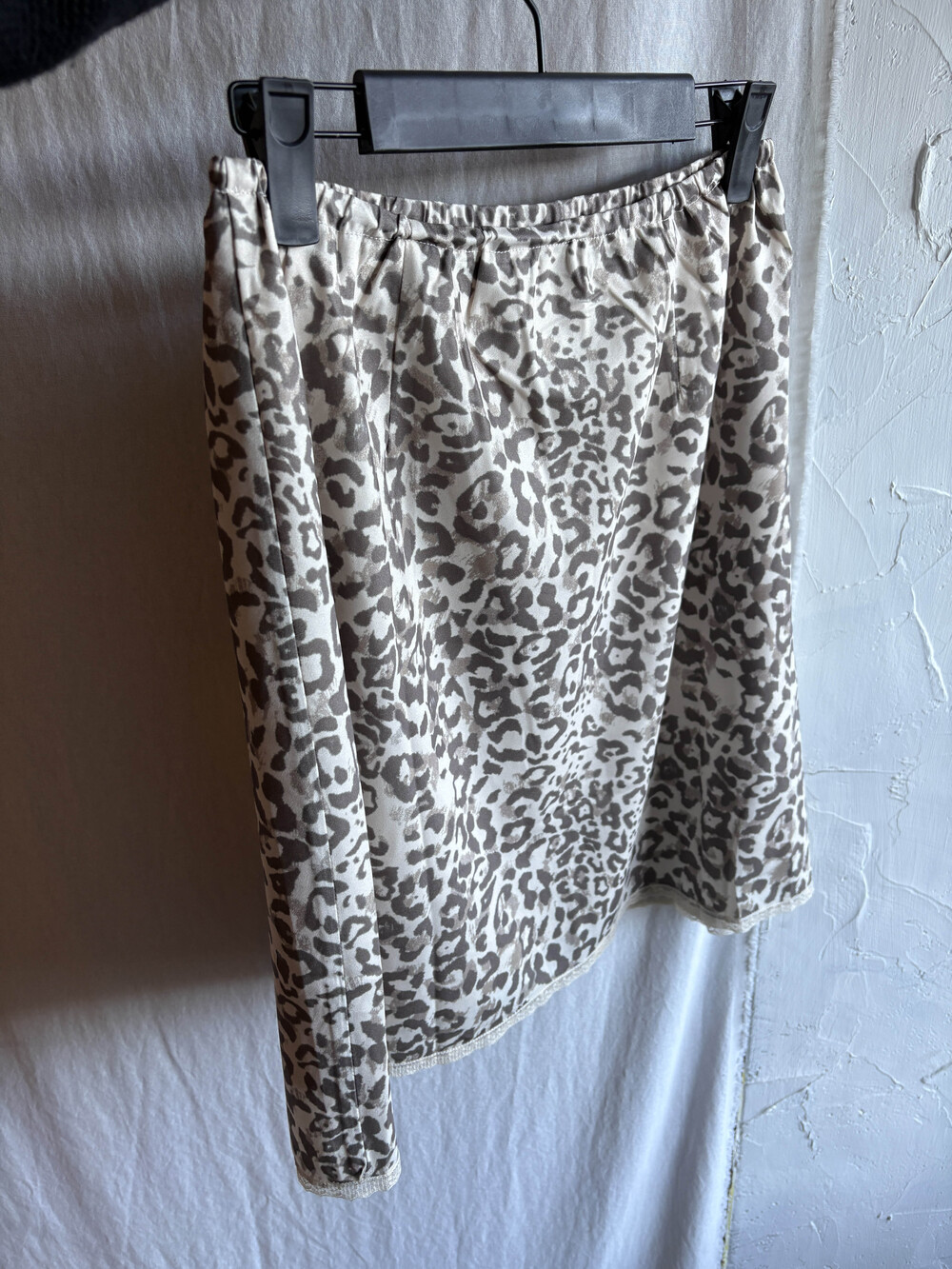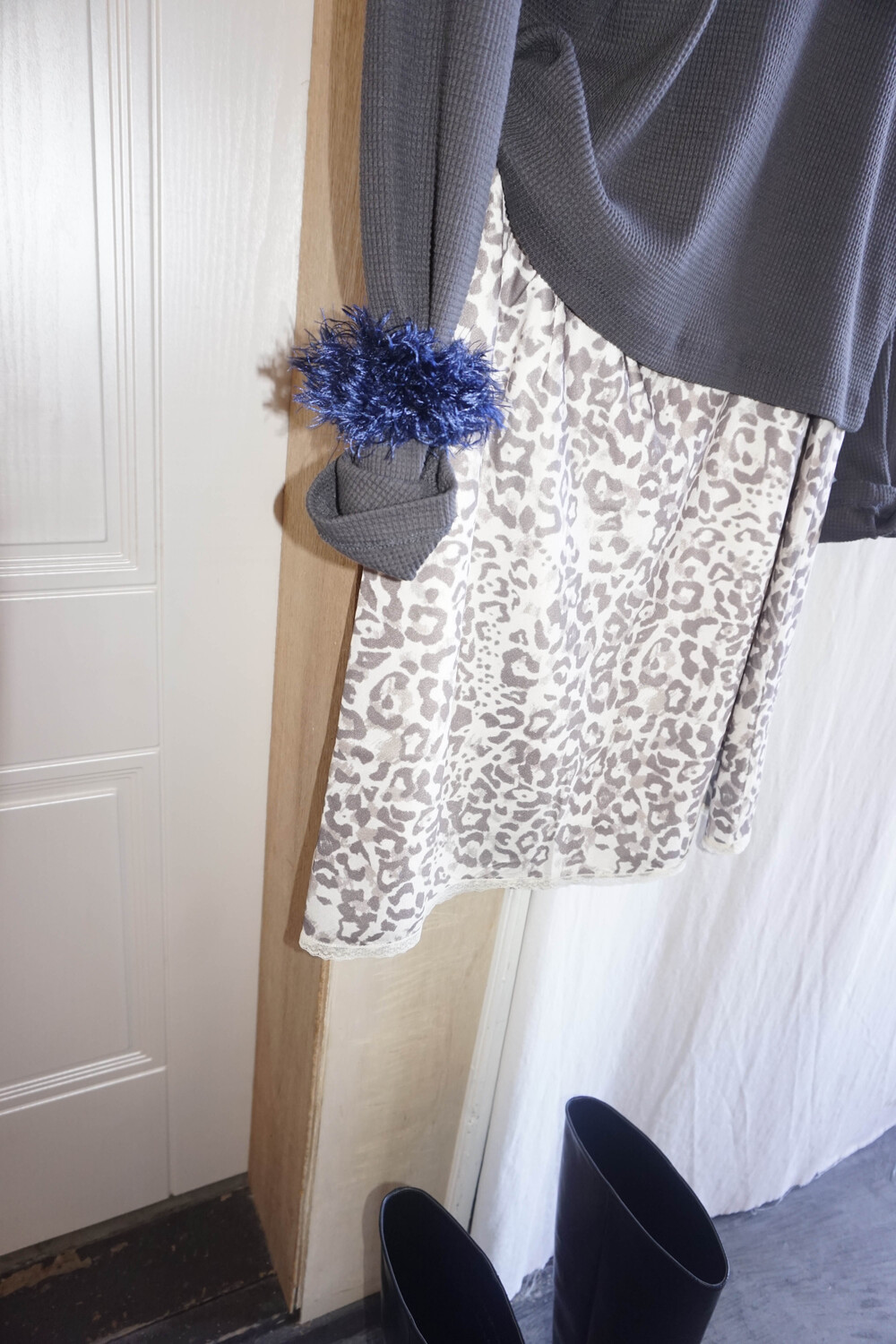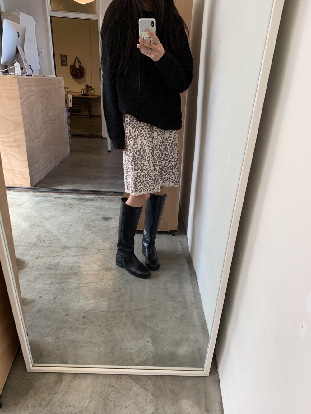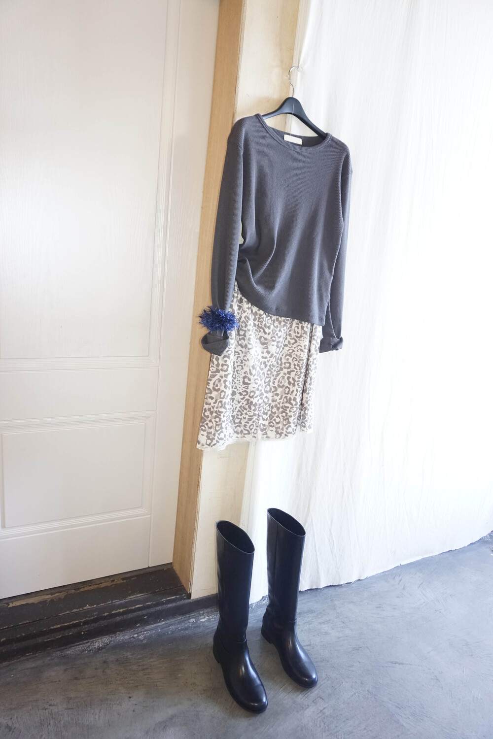 미디 기장의 호피 스커트입니다. 색감이 튀지않아서 패턴이 있어도 크게 부담스럽지 않는 것이 이 스커트의 매력 포인트에요.